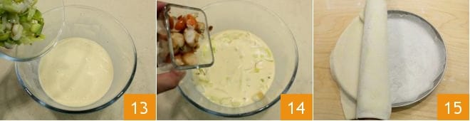Now pour the leeks 13 and the mollusks 14 into the liquid mixture. Line a 11-inch diameter mold with parchment paper and unroll the pastry, making sure it adheres well to the bottom 15.