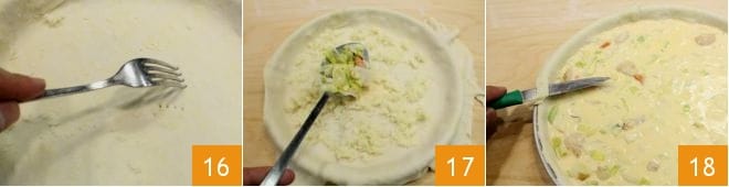 Pierce the pastry with the tines of a fork 16. You can now fill the pastry: distribute the grated Emmental cheese on the bottom and pour over the mixture of cream, eggs, leeks, and scallops 17. Trim the excess pastry with a small knife, trimming the edge of the mold 18.