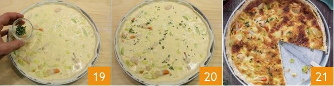 Distribute an additional handful of thyme on the surface 19 and bake the finished quiche 20 in a preheated static oven at 356°F for about 35 minutes (convection oven at 320°F for about 25 minutes). Once cooked, remove your quiche with scallops and leeks from the oven and let it cool before serving 21.