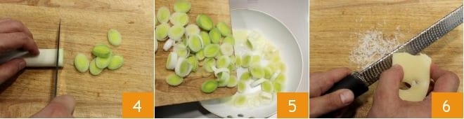 After melting half of the butter dose with a little oil in a non-stick pan, stew the leek slices over low heat for about 15 minutes until they are very tender 5. Once cooked, set the leeks aside and proceed to grate the Emmental cheese; set this aside as well 6.
