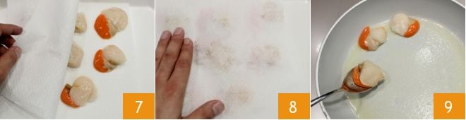 At this point, you can prepare the scallops. Place them on a tray and cover them with a paper towel 7, gently pat them to remove excess water 8. Melt the remaining butter in the pan where you cooked the leeks and brown the scallops for a few minutes, turning them with a wooden spoon from time to time 9; adjust the salt.