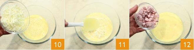 the grated provolone cheese 10 and mix with a spatula to combine the ingredients 11. Add half of the diced ham to the mixture 12