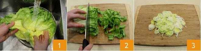 To prepare the quiche with escarole and diced ham, start by washing the escarole under running water 1, then roughly chop it 2. Clean and slice the leek 3.