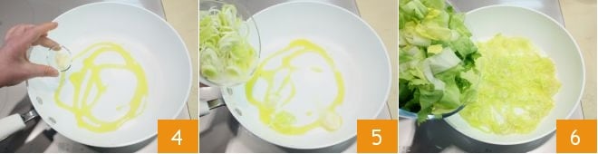 In a large pan, pour a drizzle of oil, the whole peeled garlic clove 4 (you can remove it at the end of cooking); also add the leek 5, let it wilt for a few minutes, then add the chopped escarole 6.