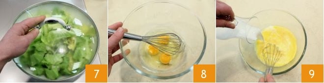Cook it for about ten minutes with the lid on 7. Meanwhile, beat the eggs with a whisk 8, then add the milk 9