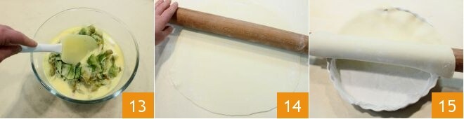 and the escarole, mixing again 13; salt and pepper to taste. Set the filling aside for a moment and take the puff pastry roll: roll it out slightly with the rolling pin 14, then roll it onto the rolling pin and unroll it onto the 11-inch diameter mold lined with parchment paper 15.