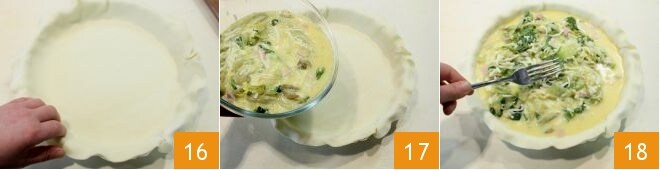Make the pastry adhere to the edges, letting some of it hang over the side 16; then gently pour the filling inside 17 and distribute it evenly with the help of a fork 18.