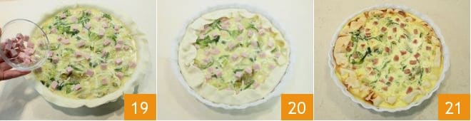 Distribute the remaining diced ham on the surface 19, then fold the edges inward 20 and bake the quiche in a static oven preheated to 355°F for 60 minutes (320°F for 50 minutes). Once cooked, take it out of the oven and let it cool slightly 21, then serve it!
