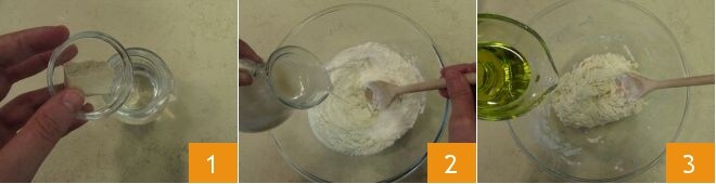 To prepare the blackberry and gorgonzola flatbread, start with the leavened dough: dissolve the yeast in water at room temperature, stirring with a wooden spoon 1, then slowly pour the mixture into a bowl with the flour 2. Continue kneading until the dough comes together, then also pour in the oil in a thin stream and keep kneading with the wooden spoon until it is necessary to use your hands 3.