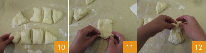 Divide it into 8 equal pieces using a dough scraper 10 and shape each piece into a ball by folding the edges towards the center (11-12).