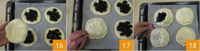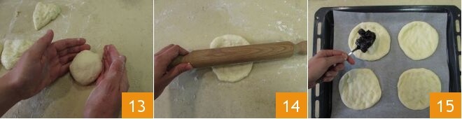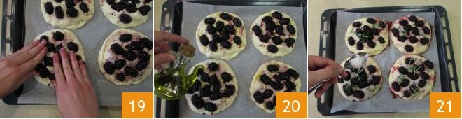 Form a ball 13, then flatten it with a rolling pin, or with your fingertips, 14 and place the first 4 flatbreads on a baking tray with parchment paper. Arrange the blackberries in the center, which will have macerated a bit by now, leaving a 1/2-inch border 15.