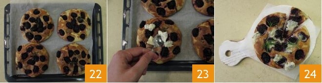 Bake the flatbreads in a static oven at 375°F for 40-45 minutes until they are well browned 22. As soon as you take out the baking tray, sprinkle with the pieces of cheese 23 and serve your blackberry and gorgonzola flatbreads while still hot 24!