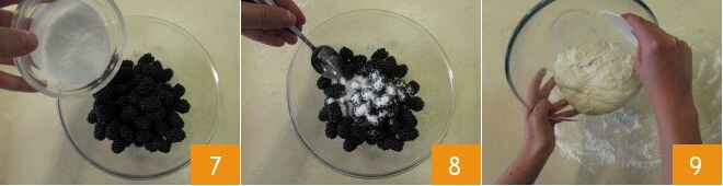 Before rolling out the dough, put the blackberries in a container 7, season with the sugar 8, mix, and set aside. Retrieve the dough and transfer it to a lightly floured work surface 9.