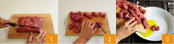 To prepare the calandraca, cut the veal into slices 1, using a sharp knife. Then divide each slice into chunks that are not too small 2. In a saucepan, pour the oil and add the veal chunks 3.