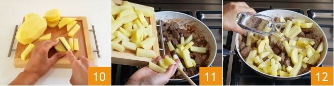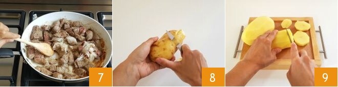 Turn the meat chunks and cook until the bacon is slightly melted 7. Meanwhile, wash and peel the potatoes 8, then cut them into thick slices 9