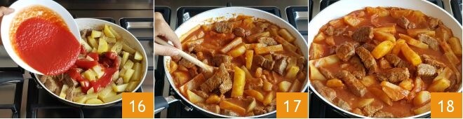 Add the tomato sauce 16 and continue to cook over medium heat, stirring occasionally 17 until the potatoes and veal are tender 18. Serve the calandraca hot.