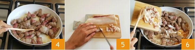 Brown over high heat for about 5 minutes 4, stirring often with a wooden spoon. Meanwhile, cut the slices of bacon into strips 5 and when the meat is well browned, add the bacon to the pan.