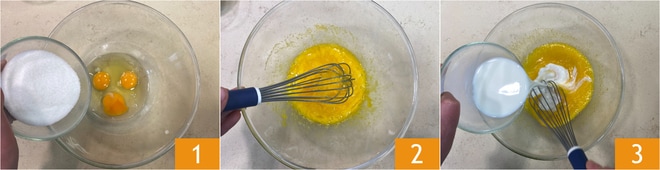 To prepare the quick Nutella cake, first pour the eggs and sugar into a bowl 1. Mix with a hand whisk 2, then add the milk gradually, continuing to mix 3.