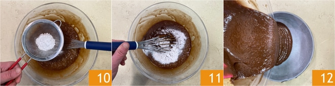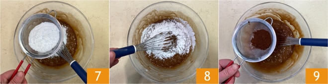 Sift the flour and baking powder directly into the bowl 7 and mix thoroughly to avoid lumps 8. Also, add the sifted cocoa powder 9.