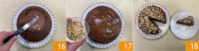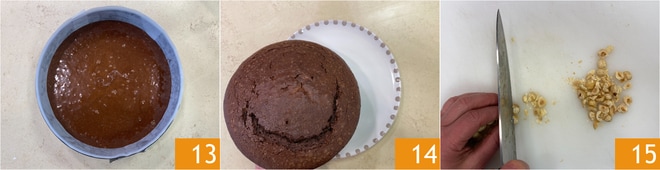 Level it 13 and bake in a preheated static oven at 350°F for 50 minutes. Check the baking with a toothpick, then remove from the oven and let it cool before transferring the cake to a serving plate 14. Proceed with the decoration: roughly chop the hazelnuts with a knife 15.