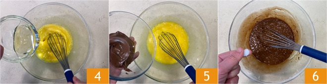 Do the same with the vegetable oil 4. Add the Nutella 5 and mix well, then add a pinch of salt 6.