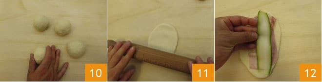 Take the dough and divide it into 4 portions of 3.5 oz each 10. Then roll each piece to get an oval about 1/8 inch thick. Place some ham and zucchini slices 12,