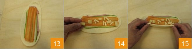 carrot slices 13 and fontina cubes 14. Gently lift the part in front of you 15