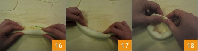 and roll it up 16. Then join the two outer ends to form a small doughnut and press with your fingers to seal them 18.