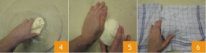 Start working everything with your hands until you get a homogeneous mixture 4, then transfer it to a work surface and knead until smooth 5. Cover with a cloth and let it rest for about 10 minutes 6.