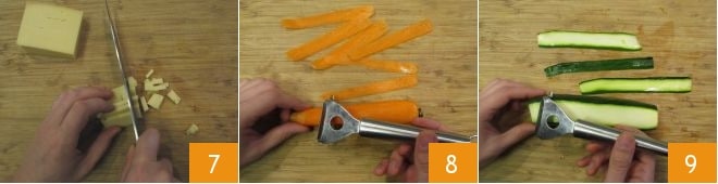 Meanwhile, dice the fontina cheese 7. Then peel the carrot and, using a peeler, create thin slices 8. Do the same for the zucchini, but this time do not peel them 9.