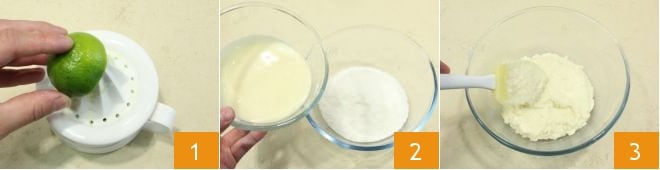 To make the Brazilian quindim, squeeze the lime juice 1, place the coconut flour in a bowl, add the condensed milk 2 and mix with a spatula to combine the ingredients 3.