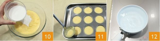 Take the mixture and lastly add the coconut milk 10, mix to combine the ingredients and pour the mixture into the mold using a ladle 11. Heat water in a saucepan 12