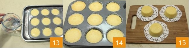 and pour it into the large tray 13 containing the mold, the water should cover two-thirds of the molds. Bake in a preheated static oven at 350°F for 40 minutes (or 320°F fan oven for 30 minutes). Once cooked, take your quindim out of the oven 14 and let them cool before unmolding, turning the mold over onto a tray. The Brazilian quindim are ready to be enjoyed 15.