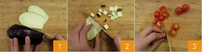 To prepare the quinoa eggplant and mint, start with the eggplants: wash and trim the eggplants, slice them 1, then dice them 2. Also, wash the cherry tomatoes and cut them into 4 parts 3;