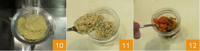 Once ready, drain it using a sieve and cool it under running cold water 10. Assemble the quinoa eggplant and mint recipe in a jar with a capacity of 70 cl by first pouring a layer of quinoa 11, then the eggplants and cherry tomatoes 12.