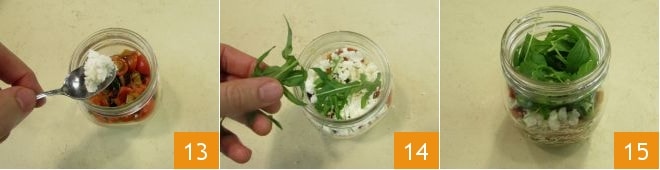 Continue with the feta 13 and the arugula previously washed and patted dry 14. Your quinoa eggplant and mint recipe in a jar is ready to be served 15, also transported as a lunch break meal!