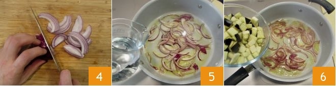 Clean the red onion and slice it 4; in a pan, pour a drizzle of oil and add the onion, cook over medium-high heat; pour water to facilitate cooking 5 and prevent burning, stirring occasionally. After 5-6 minutes, add the eggplants 6