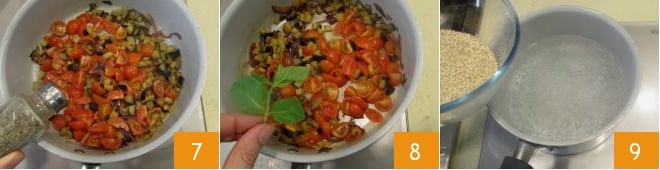 and the cherry tomatoes, keeping the heat medium-high; salt and pepper to taste 7. It will take about 5-6 minutes on high heat, stirring occasionally. When the seasoning is ready, flavor with mint leaves with the heat off 8. Meanwhile, rinse the quinoa, then cook it in boiling water 9; follow the times indicated on the package.