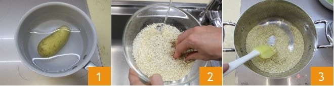 To prepare the quinoa mini burgers, start by boiling the potato for about 15 minutes 1. Then proceed by rinsing the quinoa well under running water 2. Next, toast the quinoa in a pot with a drizzle of oil, stirring often with a spatula 3.