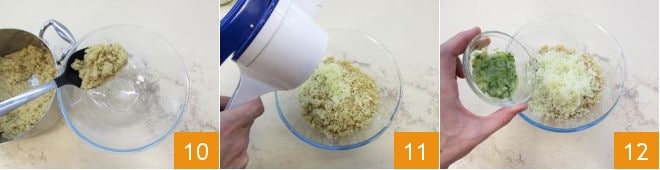 Pour the fluffed quinoa into a large bowl 10, then add: the mashed boiled potato 11, salt, pepper, and the sautéed scallion 12.