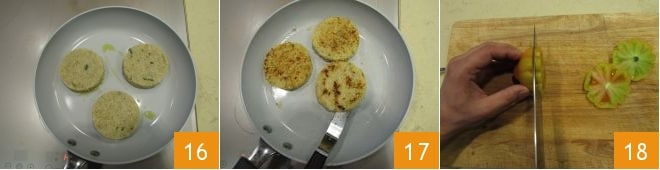 Brown the quinoa burgers in a non-stick pan with a drizzle of oil 16 for about 3 minutes on each side 17. Meanwhile, cut the tomatoes into slices about 0.2 inches thick 18.
