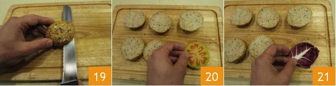 At this point, all that's left is to assemble your buns. Cut them in half 19 and add on the bottom half: the tomato 20 and a radicchio leaf.