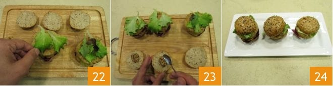 Also place the quinoa burger and some mixed greens 21, then spread mustard on the top half of the bun 21 and close it. Serve your quinoa burgers hot 22!