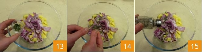 Transfer everything to a bowl, season with the chopped rosemary needles set aside earlier 13, thyme leaves 14, salt, and pepper 15.