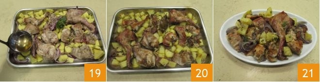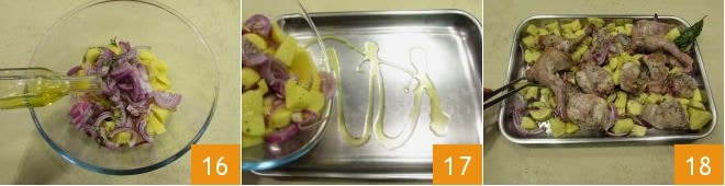 Drizzle with 1.5 tbsps of oil 16 and mix the potatoes and onions to season them evenly. Transfer everything to a large baking sheet, oiled with about 2 tsps of oil 17, so that the potatoes and onions are well distributed. Then also place the previously browned rabbit pieces 18.