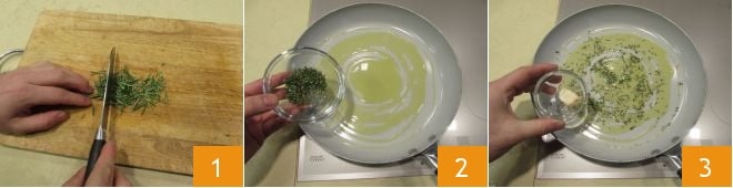 To prepare oven-baked rabbit, start by making the Vegetable broth; alternatively, you can use an equal weight of hot water. Then chop the rosemary 1, transfer half of it to a pan where you have poured 3 tbsps of oil 2, and add the peeled garlic clove 3.