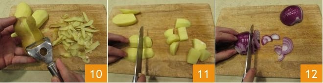 In the meantime, prepare the potatoes by peeling 10 and cutting them into rather large chunks 11. Slice the onion as well 12.