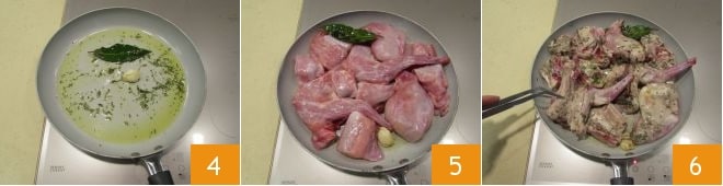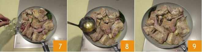 Add a bay leaf 4 and let everything simmer on low heat for 2-3 minutes. At this point, increase the heat and add the rabbit pieces 5, let them brown on both sides for 3-4 minutes 6, salt, and pepper.