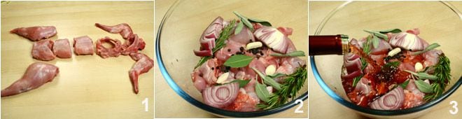 Remove the head, innards, and any trace of fat from the rabbit, then wash it under cold water and cut it into pieces 1. Place the rabbit pieces in a container along with juniper berries, black peppercorns, two cloves of garlic, half an onion, a sprig of rosemary, bay leaves, and sage leaves 2, then cover everything with red wine 3 and let it marinate for at least two hours in a cool place (or overnight in the refrigerator).