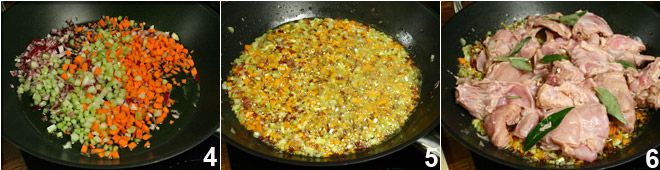 After the necessary time has passed, drain the rabbit and discard the marinade wine. Prepare a mince of onion, garlic, carrot, and celery 4 and let it brown in the oil 5, then add the rabbit pieces to the pan 6 and let them brown over medium heat along with the aromas.